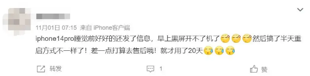 近日,某iPhone 14 Pro机主表示自己9月份入手的iPhone 14 Pro在最近的使用中常常出现各种充电断连的情况,充电状态极其不稳定。具体表现为:睡觉前充上电之后,第二天突然无故开不了机,先后使用其他苹果手机进行充电尝试,发现充电器没有问题。后又在公司更换了充电器进行尝试,手机依旧无法开机,即便是长按开机键也没有反应。