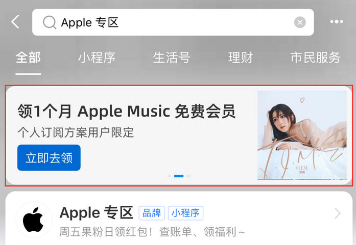 近日,支付宝 Apple专区上架“Apple Music 免费畅听礼包”权益,想要体验 Apple Music 的用户不要错过,领取卡包后可在 7 天内兑换价值 11 元的国区 Apple Music 月卡。